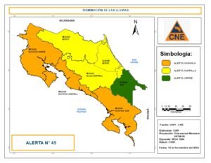 Según el IMN, las lluvias en la última jornada han sido principalmente en el Pacífico Norte, Valle Central y Zona norte entre débiles a moderadas, bastante aisladas. El pacífico Central y Sur con presencia de algunas lluvias aisladas débiles y el Caribe con registros muy bajos. La Zona norte es la que presentó la mayor cantidad de lluvia por alguna inestabilidad que dejó Sara, con hasta 122.6 mm.